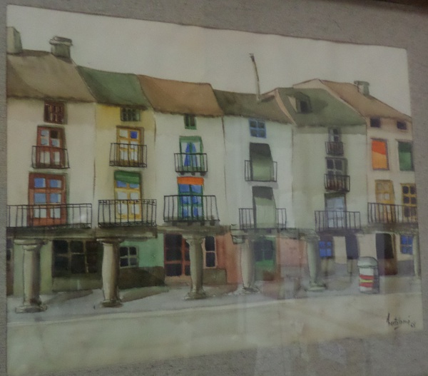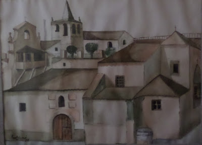 Dos de ellos nos muestran poblados con casas, puertas destacadas y variadas, ventanas, y balcones. En un cuadro se ve la torre y en el otro unos soportales que nos recuerdan a pueblos cercanos de esta misma provincia.Y a destacar los colores en tejado y fachadas, colores vivos que tanto utiliza en sus pinturas.