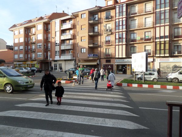La plaza está urbanizada y más o menos controlada desde el punto de vista del tráfico de vehículos y de personas. En este caso el Ayuntamiento ha preferido el uso de los pasos peatonales bien señalizados, a la instalación de semáforos en varios puntos, que establecerían un mejor control. Entre los pasos peatonales el más importante es el que se encuentra, más o menos,  entre las calles de los Herreros y la avenida Maragatos. Es amplio, pero durante casi todo el día está ocupado por la mucha gente que necesita pasar de un lado a otro de la plaza. Y también, cuando les está permitido, pasan muchos vehículos, que, en ocasiones, impiden el paso normal de las personas, que ya han comenzado a pasar por el lado contrario. Se observa cierto temor o miedo en algunos momentos. Aunque coches y personas se están acomodando a ello, no deja de crear cierto problema. Si la situación fuese a peor, tal vez, en el futuro, la solución sería la instalación de semáforos, a lo que también conviene se acostumbren los ciudadanos.